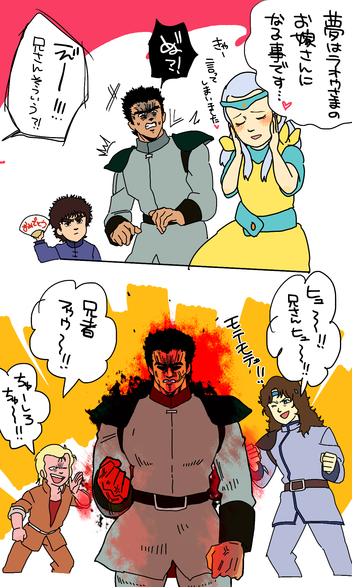 ジャギ様好き。特にアニメ第98話「ゆれる南斗の都!遂に北斗2兄弟がやってきた!!」の少年ジャギ様は良い!女の子だとユリア様が推し。存在で振り回す美人っていいよね~。