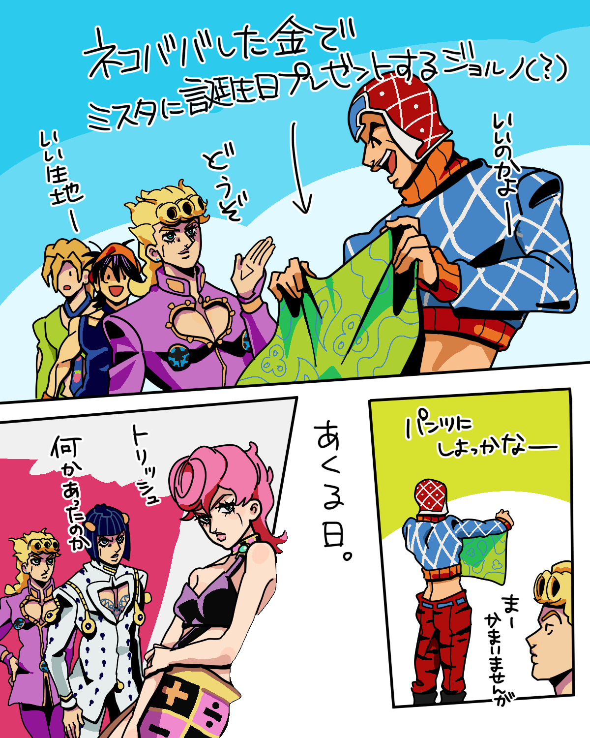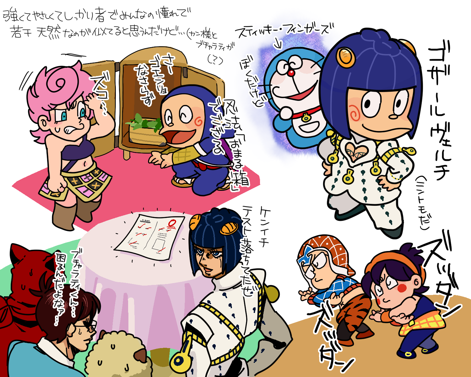 ブチャラティがハットリくんだったらめっちゃかわいいのでは!という絵(?) チームのみんなもカワイイ…って思ってるに違いない(?) カン様はアバ茶に気付けるだろうか?トリッシュ相手には微妙にデリカシーないかも…(?) でもやっぱり頼れてかっこよくてついでにトリッシュも惚れさすんだろな…かっけえ…(?)逆バージョンも描きたい(???)