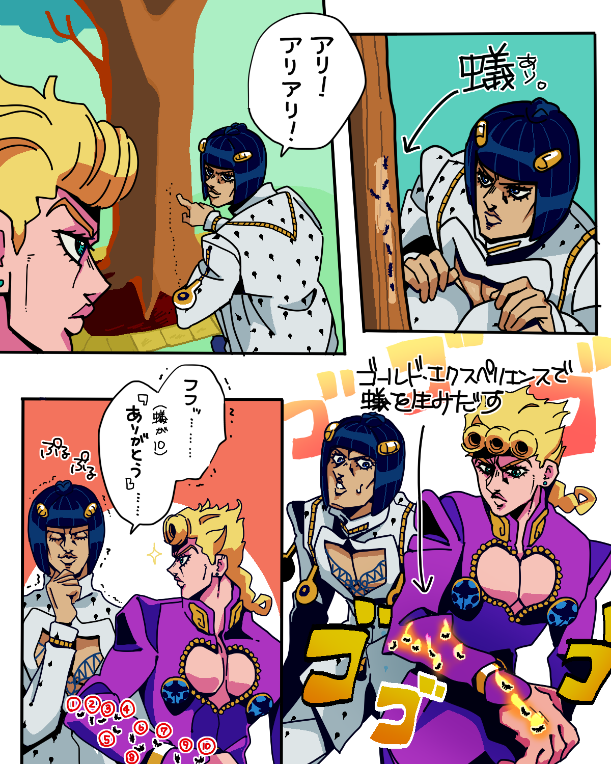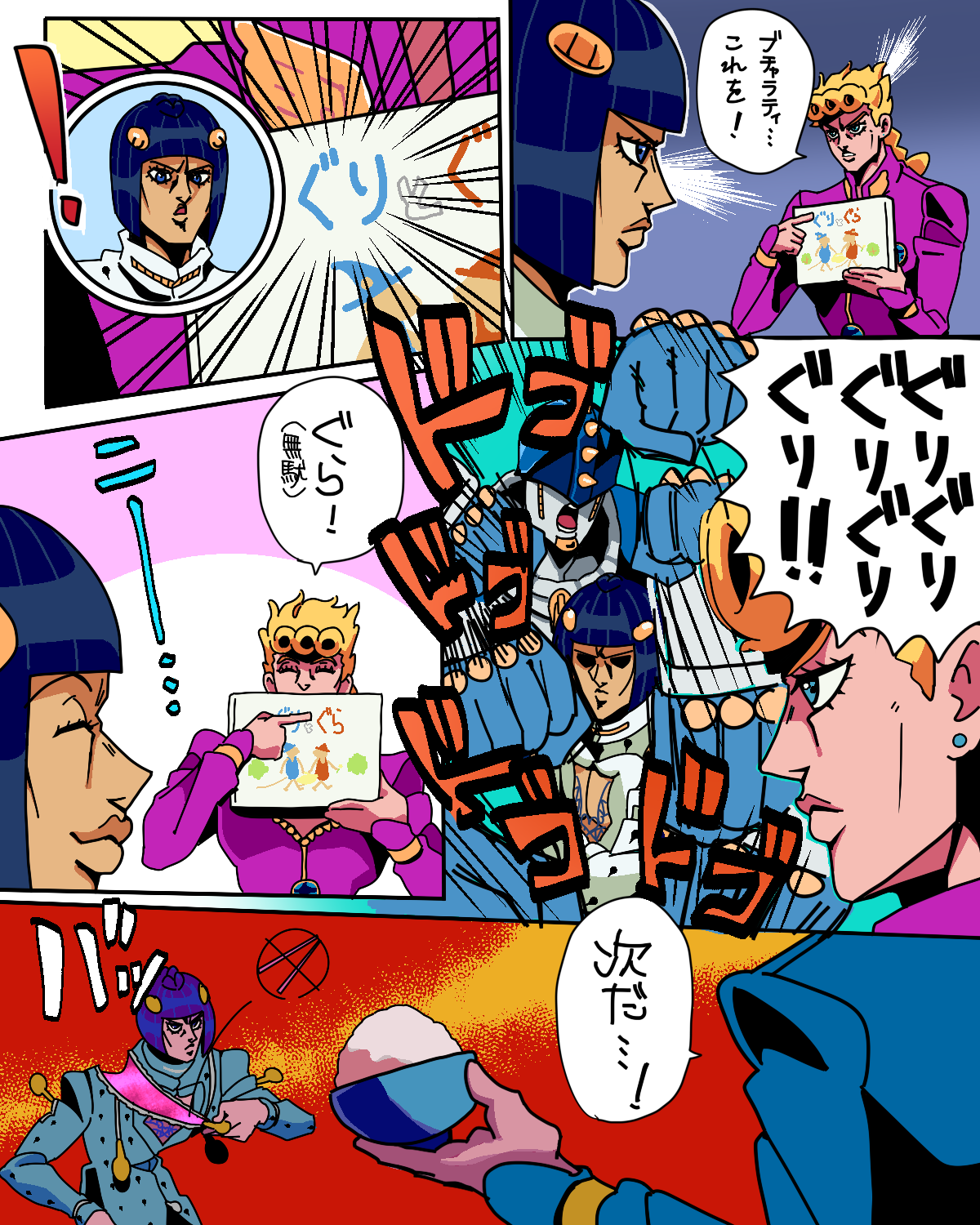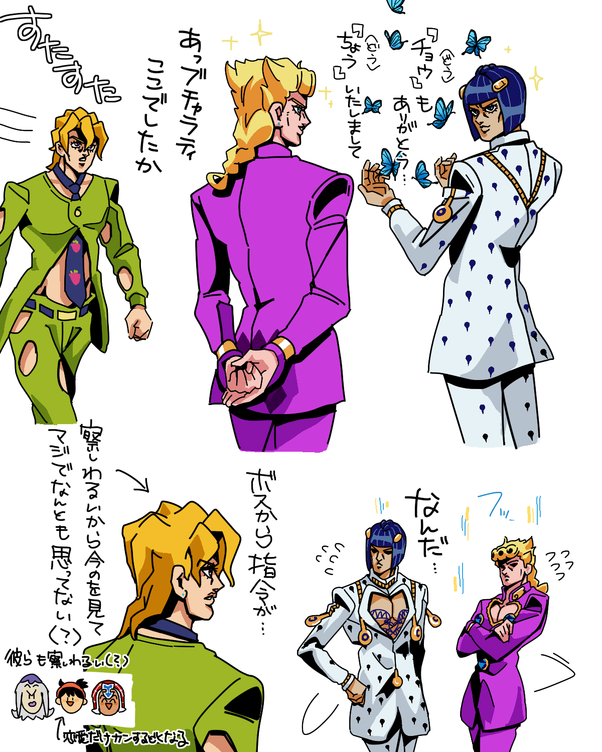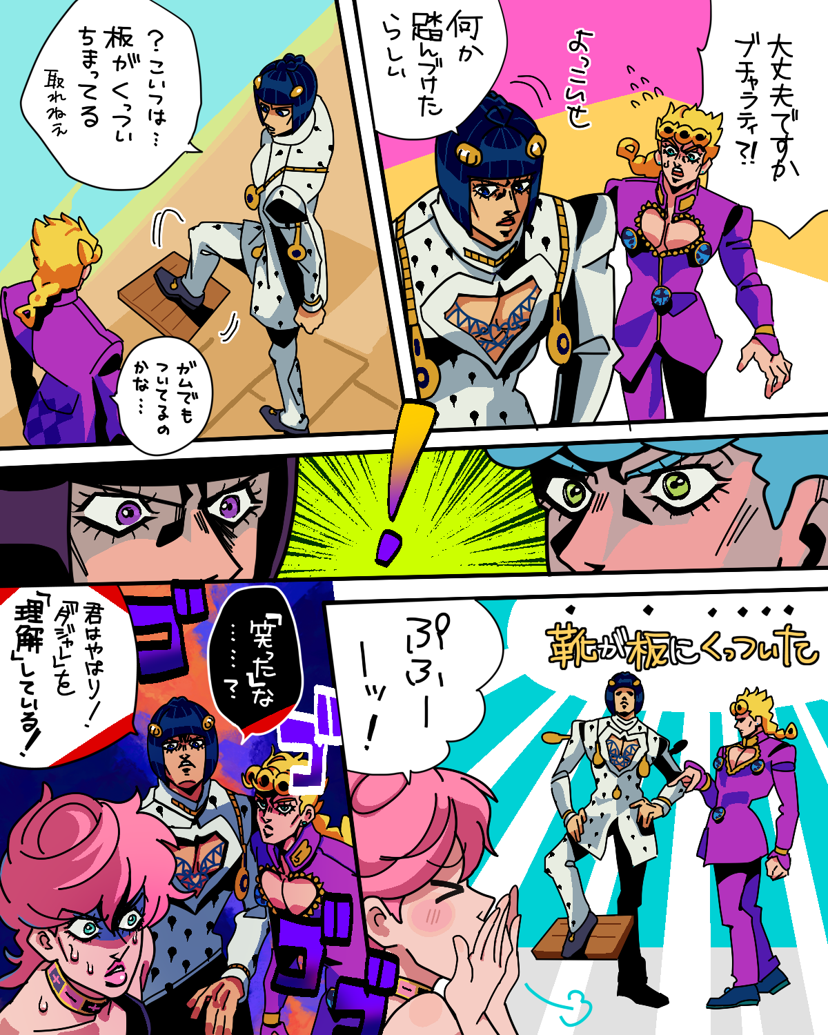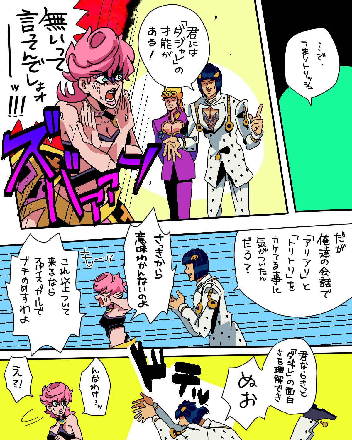 ダジャレに真剣に向き合うジョルノブチャラティ(ポルノグラフィティのイントネーション(?))は面白いと我々姉妹の間で話題。なにこれ?? わたしのダジャレ力がつたないので妹の協力あってのネタである。
