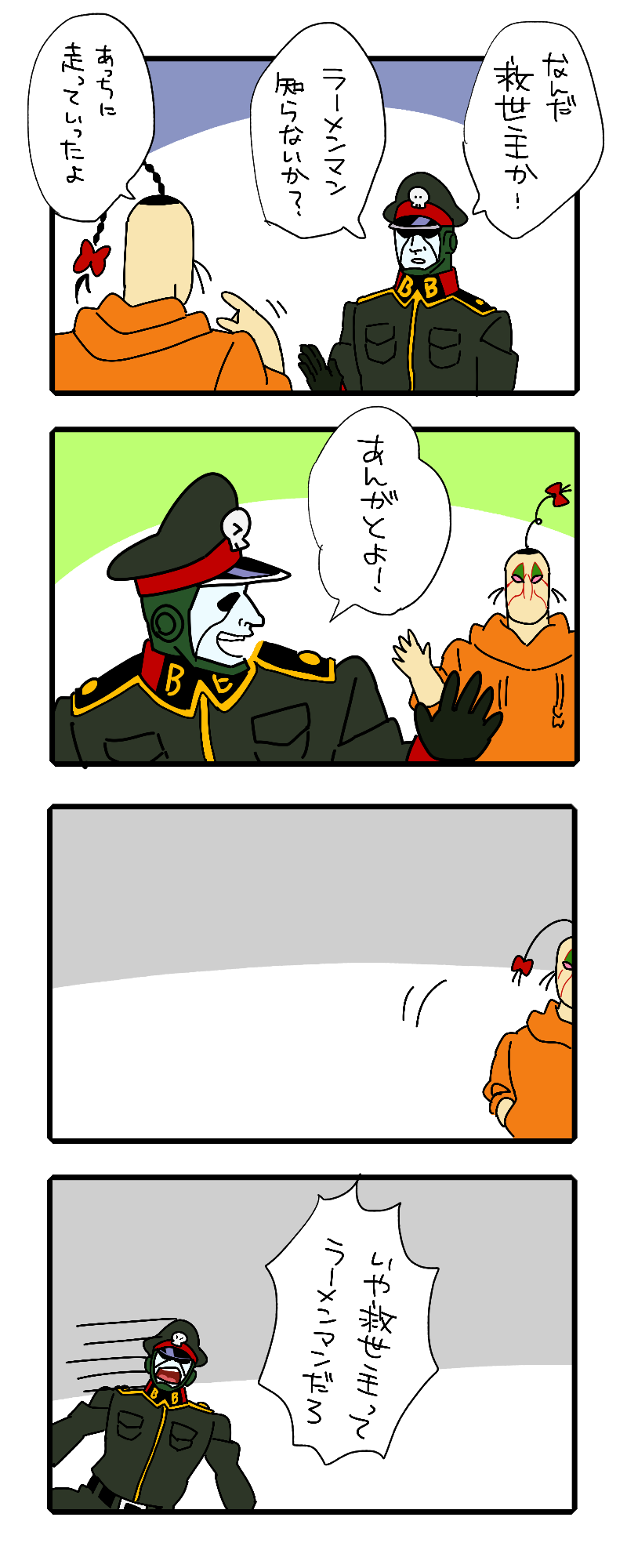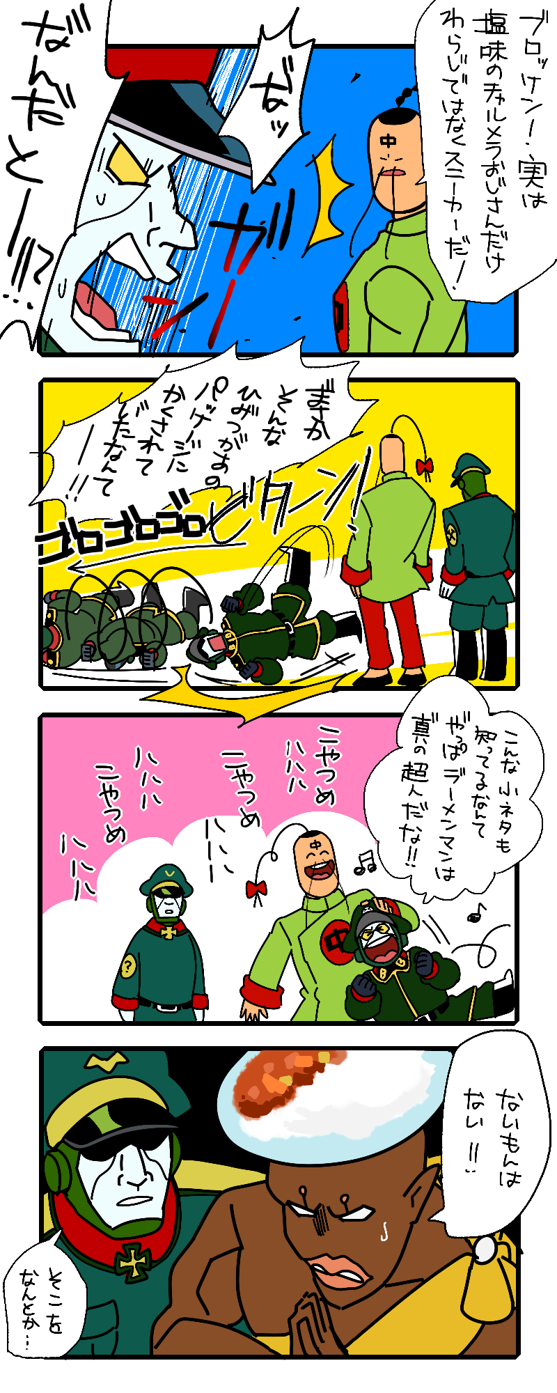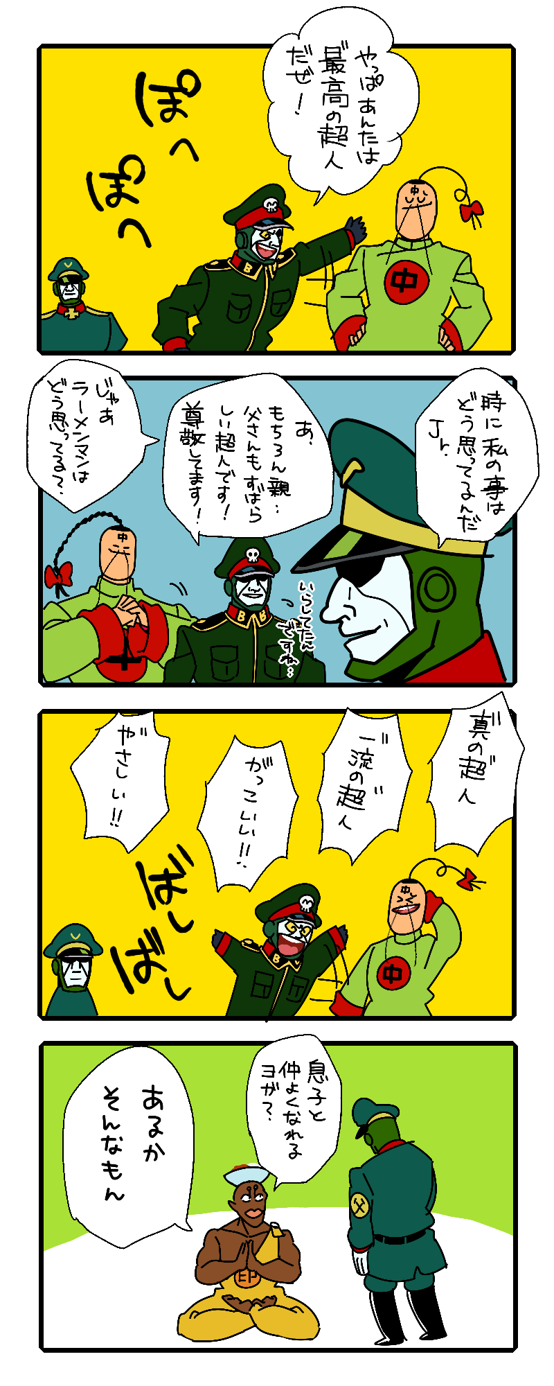 わかりにくいから補足すると、ブロッケンマンは誇り高き軍人かつ堅物な人だから、急に冗談を言っても厳しく育てられてきたJr.的には「おお~言葉の意味はわからんがとにかく凄く重要なことを教えてくれている」と真面目に捉えてしまっている、でもラーメンマンの言う事はシンプルに理解するのでスッと入ってくる。だから二人が全く同じ内容を話していてもJr.の反応が違うのだ!という親子のすれ違いネタです。