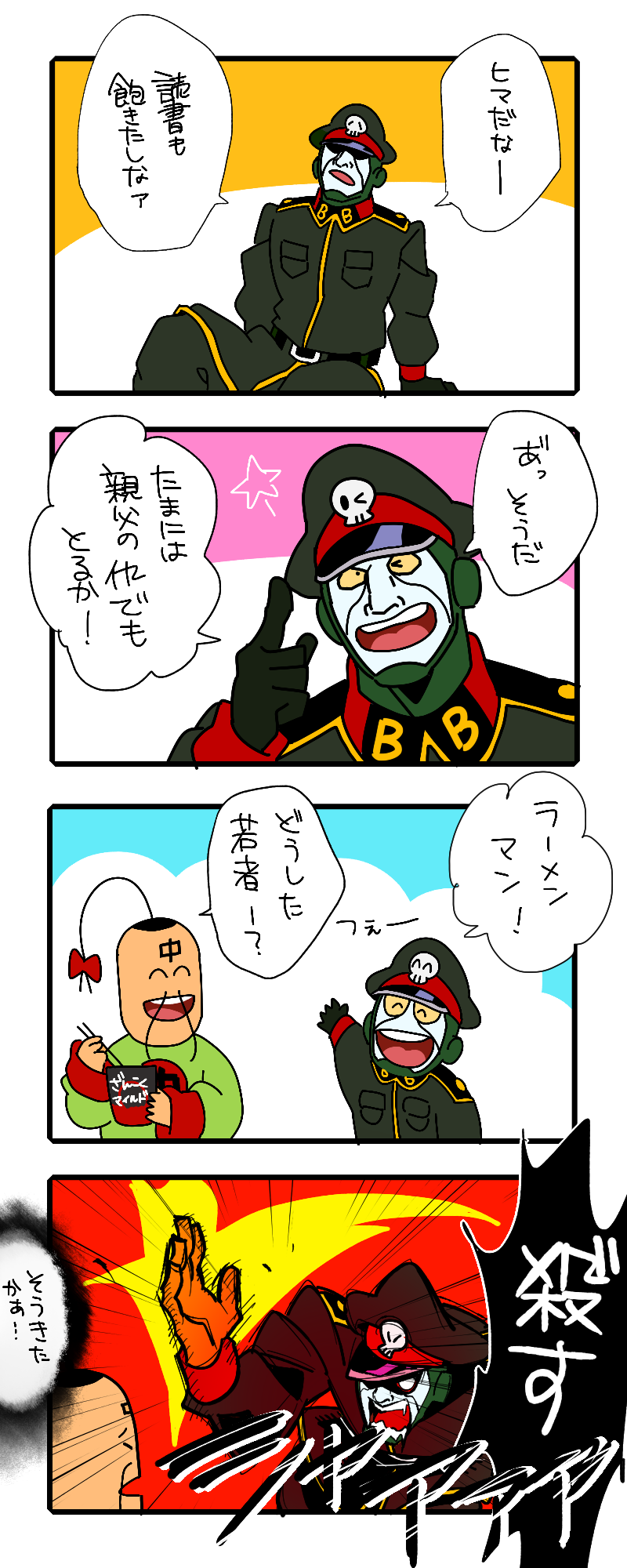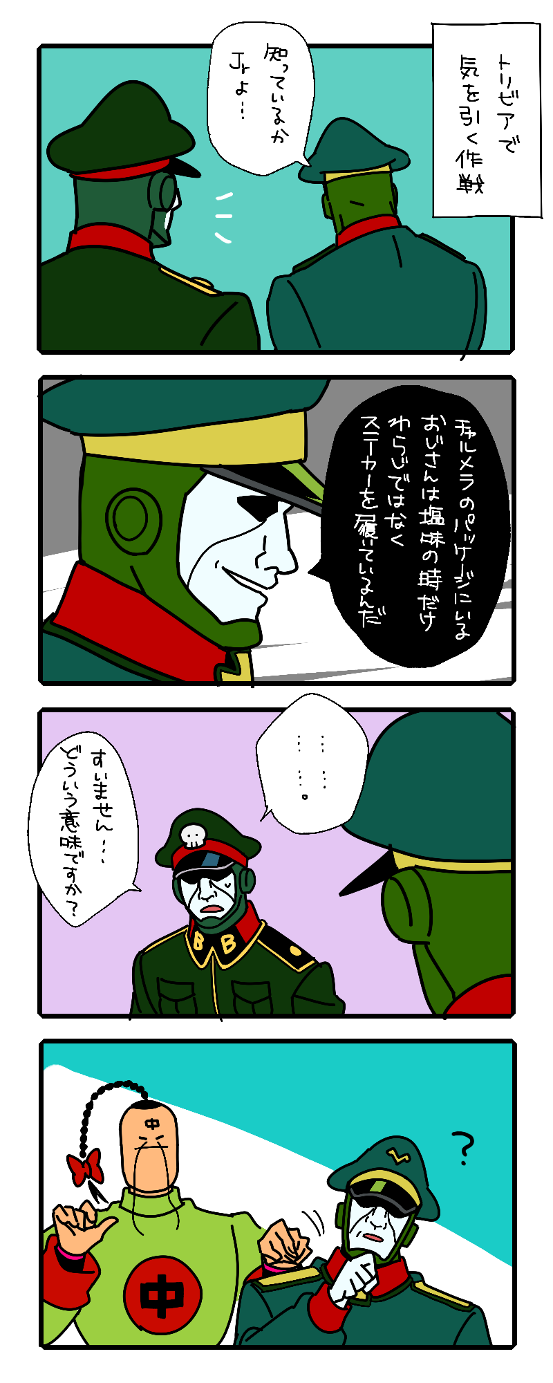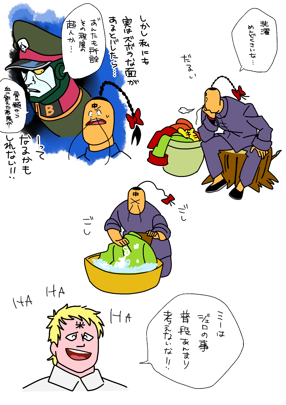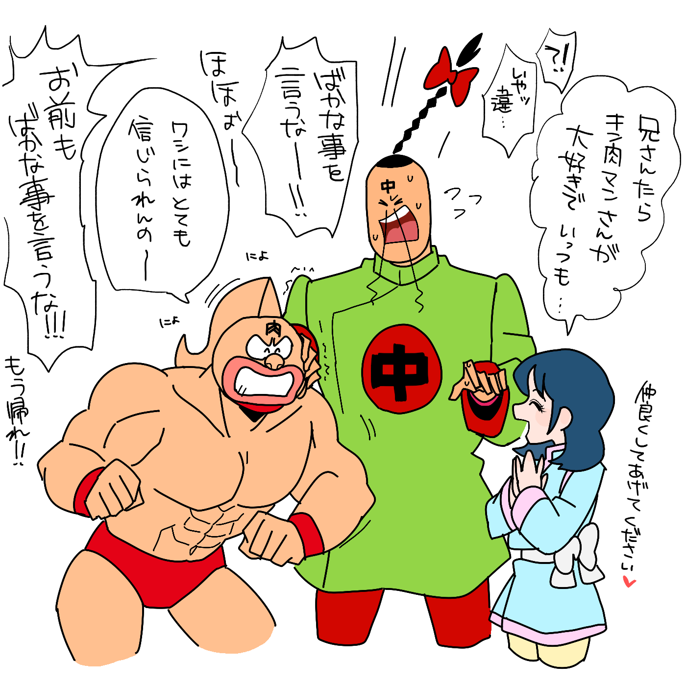 わかりにくいから補足すると、ブロッケンマンは誇り高き軍人かつ堅物な人だから、急に冗談を言っても厳しく育てられてきたJr.的には「おお~言葉の意味はわからんがとにかく凄く重要なことを教えてくれている」と真面目に捉えてしまっている、でもラーメンマンの言う事はシンプルに理解するのでスッと入ってくる。だから二人が全く同じ内容を話していてもJr.の反応が違うのだ!という親子のすれ違いネタです。