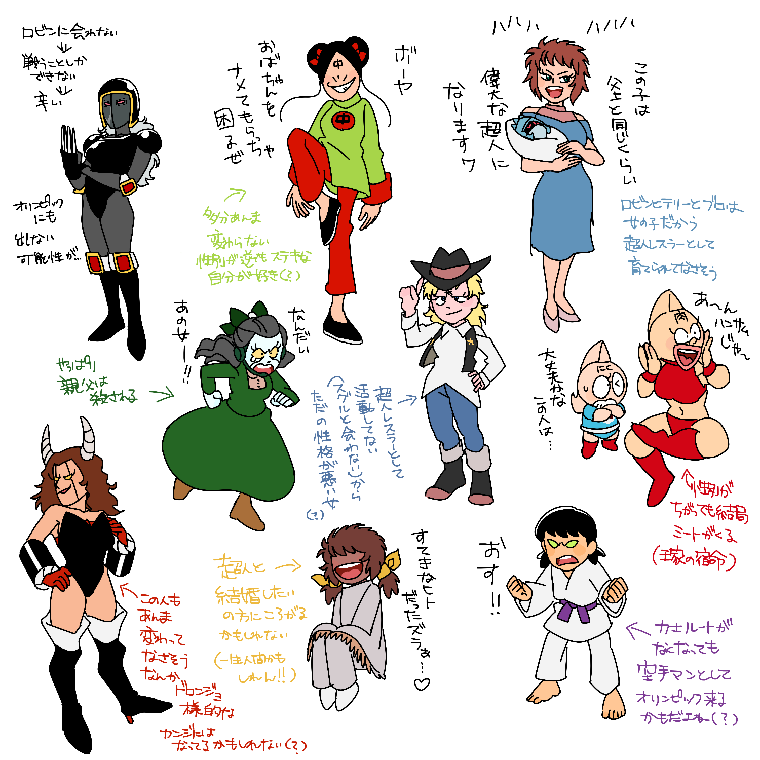 ▲レディー世界とは関係なく本編で性転換ネタができないかやってみた絵。女性として生まれた時点で超人レスラーとして育てられてない人も多そうだなあ…話広がらねえな…ということでボツになった記憶。